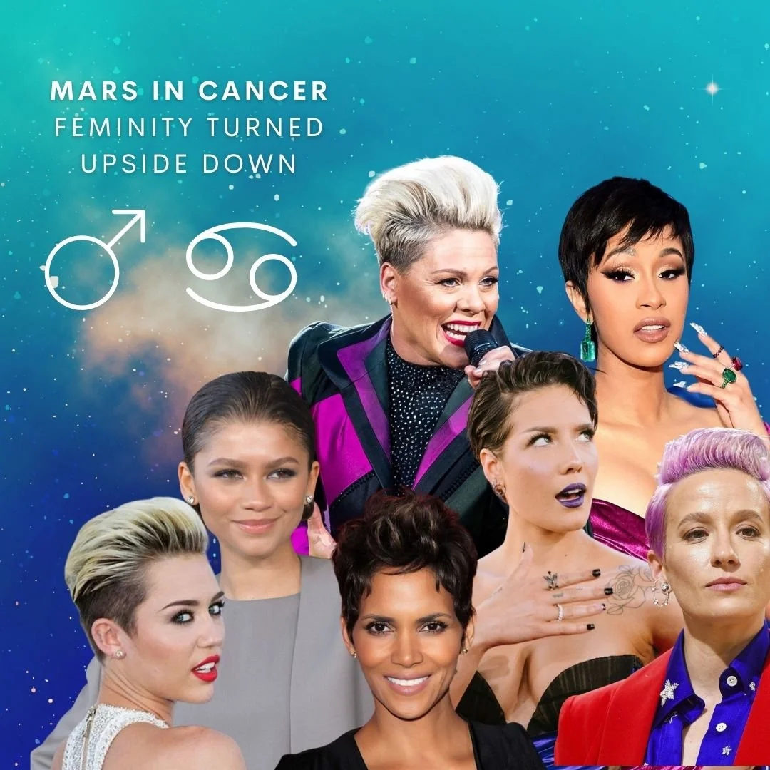 I decided to look up the natal charts of famous women who were born with Mars in Cancer and I couldn't help but notice a theme. I found that women like, Miley Cyrus, Halle Berry, Megan Rapinoe, Audrey Hepburn, Pink!, Halsey, Tilda Swinton, Selma Blair, Liza Minelli, Zendaya…and what stood out to me was that these are women who have cut off their hair at some point or currently still sport a short cut! To me, that was powerful and symbolic of this natal placement. Long hair on women has always stood as a status of traditional “beauty” and “femininity” and these women said, “No thanks!” They don't feel obligated to present themselves through society’s standards in relation to femininity. There is an empowering rejection of what the stereotypical ideal of a woman is and what she should look like. These women also share a balanced sense of masculine and feminine energy.